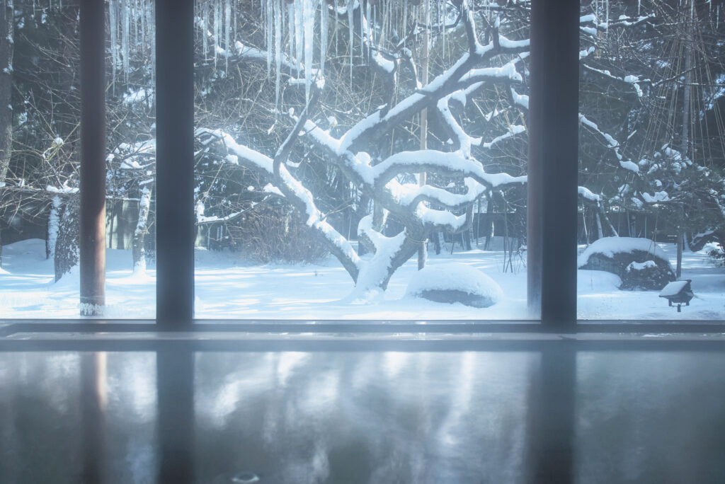 運が良ければ、程よく降る雪をお風呂からゆったりと眺める、そんな素敵な時間が過ごせるかもしれません。 (2020年は、大浴場の軒先に氷柱が立ちました。)