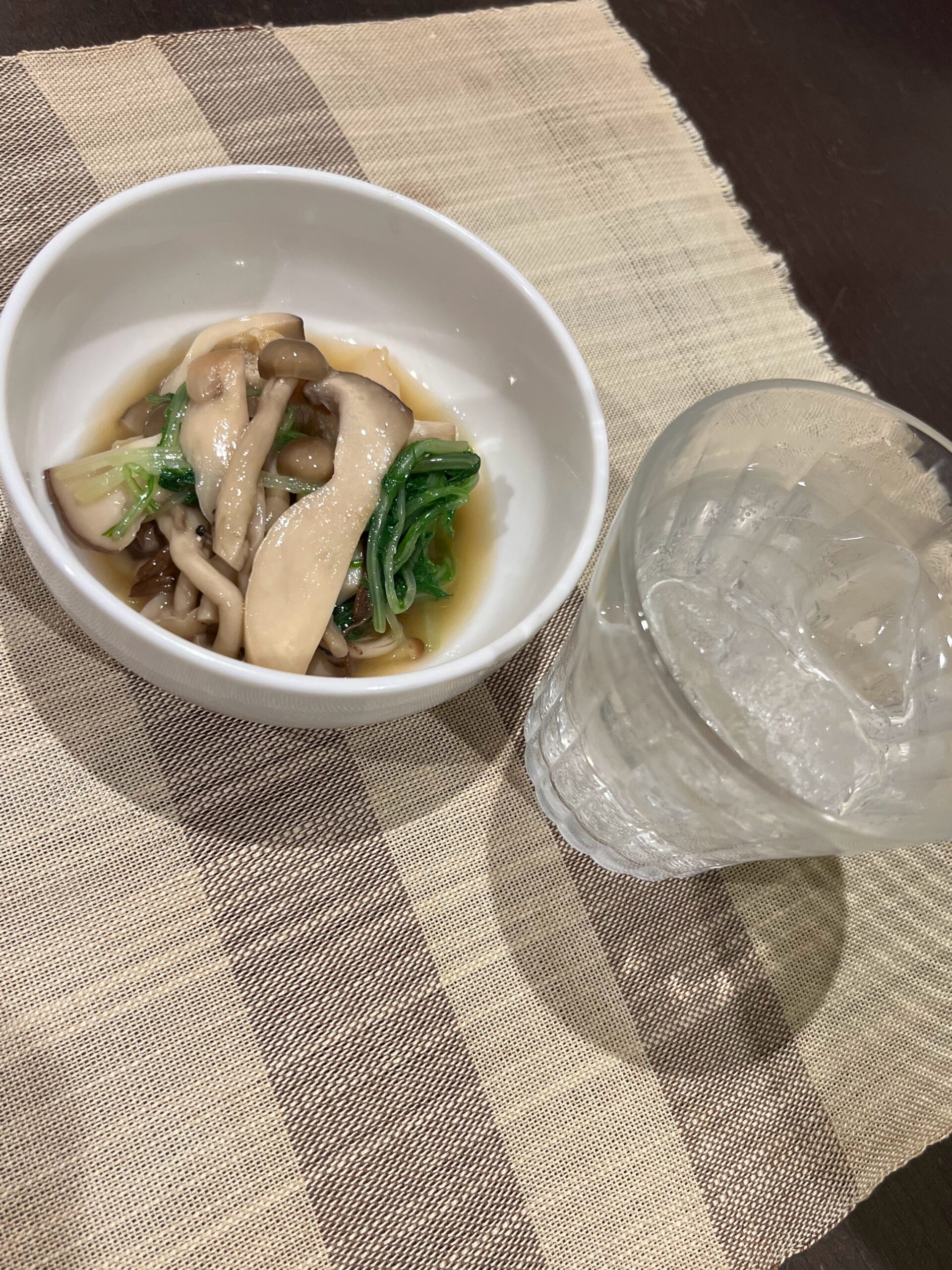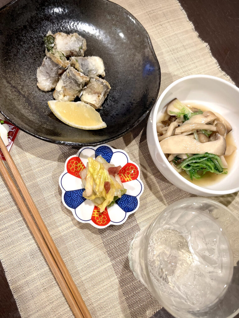 代表より和食にも合うと伺っていたので、和のお惣菜を作ってソーダ割で晩酌実験をしました!使用ボタニカルを意識して「アジ紫蘇揚げ」「きのこのお浸し」「白菜梅干し漬け」と合わせてみました。