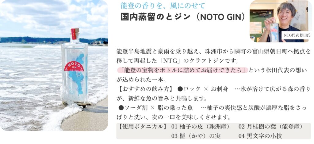 能登半島地震と豪雨を乗り越え、現在はふるさとの珠洲市と、隣町の富山県朝日町の二拠点で活動を続ける「NTG」のクラフトジンです。