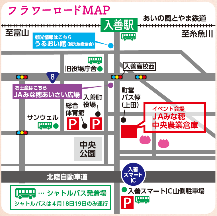入善駅、旧入善町役場庁舎駐車場、サンウェル駐車場、入善スマートインターチェンジ南側駐車場から運行していますので、ぜひご利用ください。↓